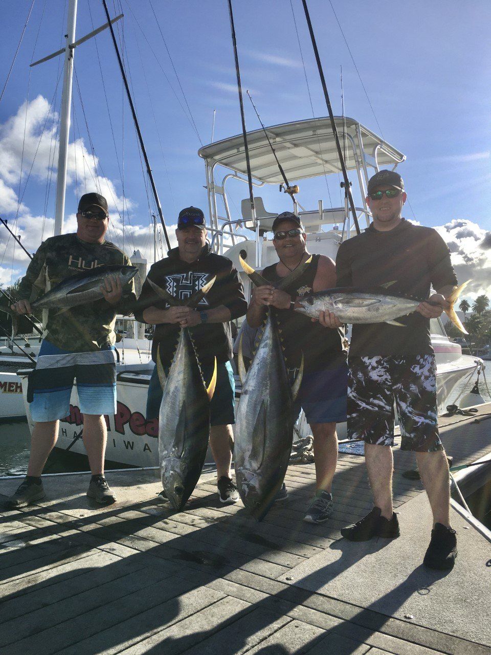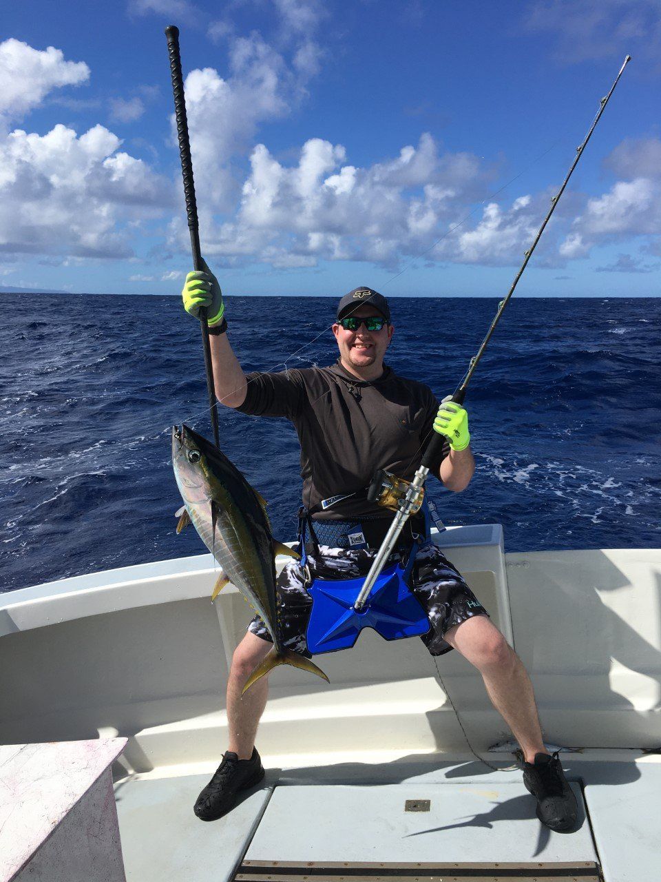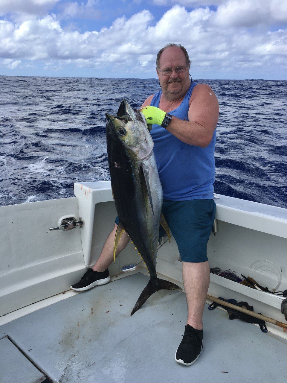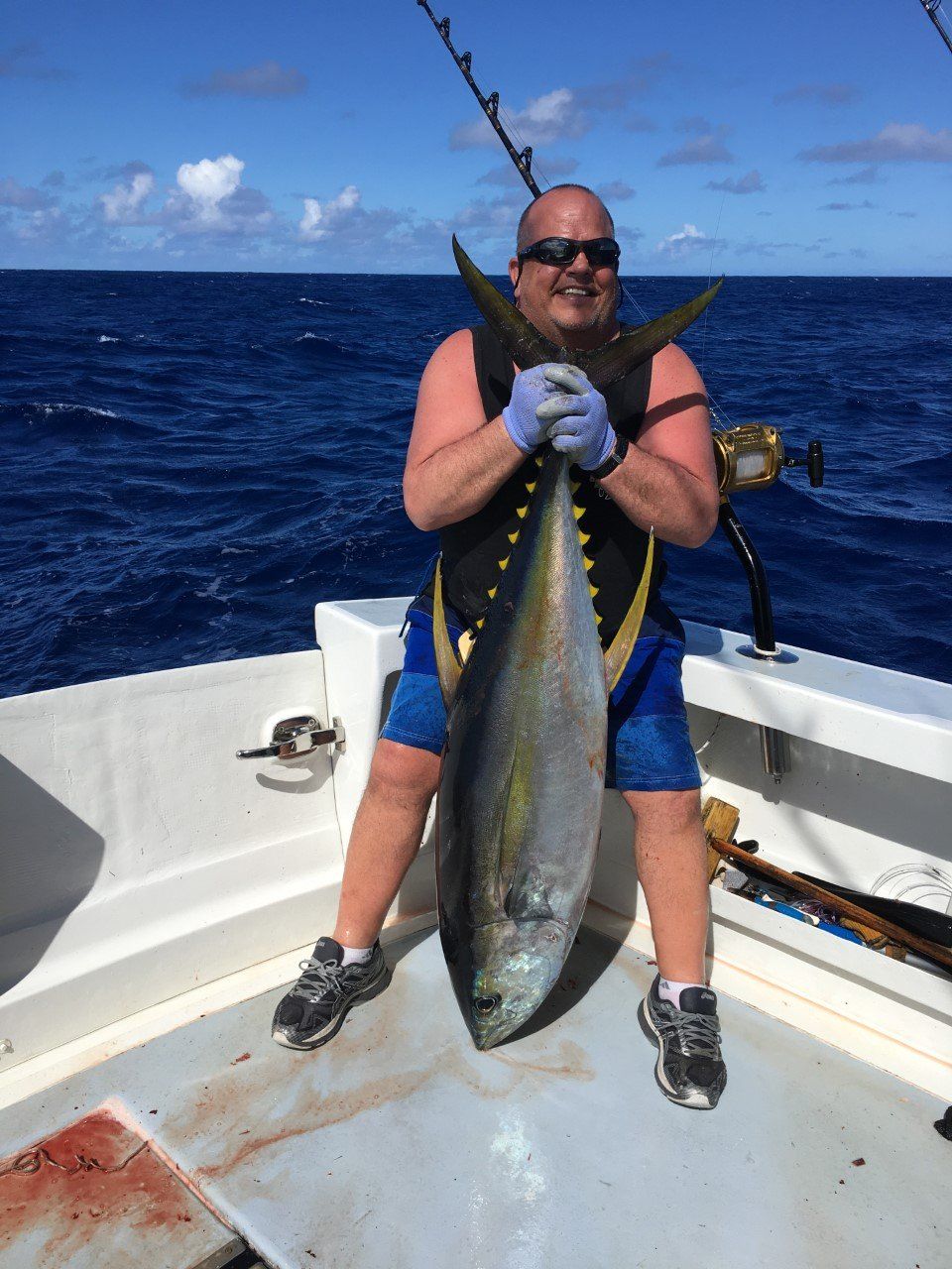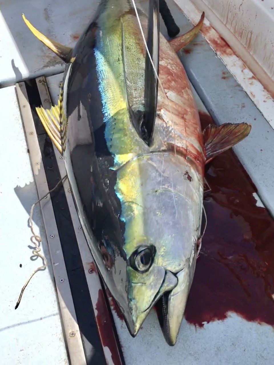 Some bigger fish moved in for Michael, and his friends! We started off light tackle fishing with a standup harness catching smaller yellowfin. When the bigger tuna showed up we put the light tackle away. The bigger tuna weighed in at over 72 lbs (without the gills and guts). We remove the gill and guts from the tuna as soon as it is caught in order to make sushi grade fish. When these tunas get over 100 lbs we call them Ahi. When they are under 100 lbs we call them Shibi.