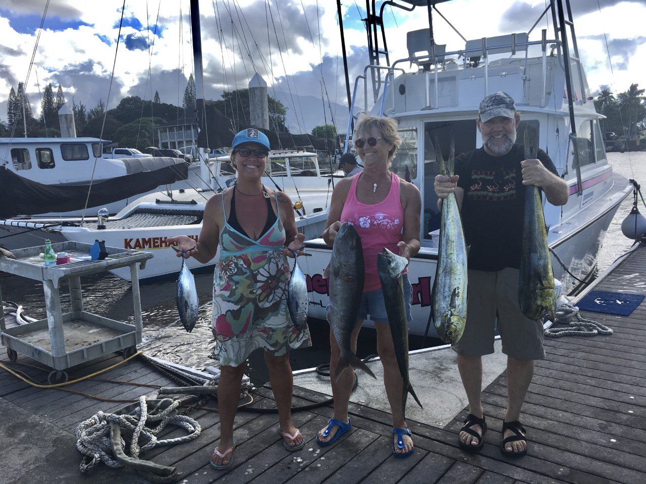 Jenny is a pilot, and a good friend of ours. She took her Mom and Dad fishing and caught 3 Mahi-mahi, a grey snapper, and some small tunas