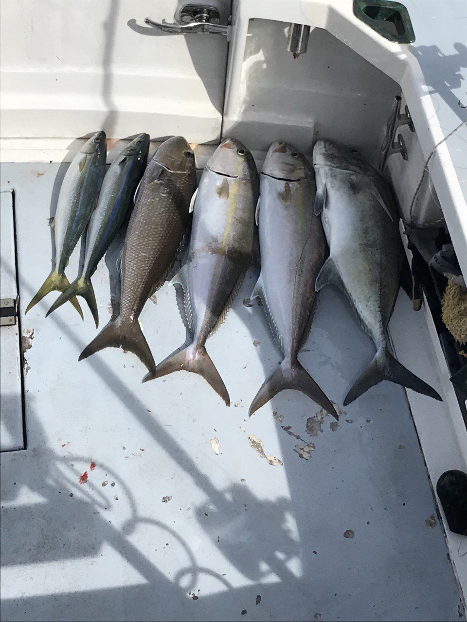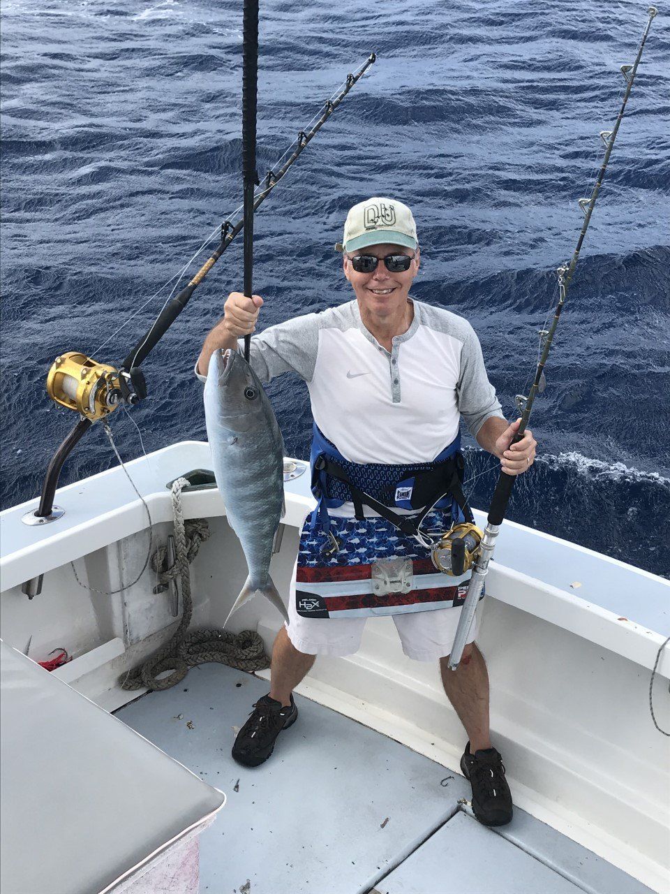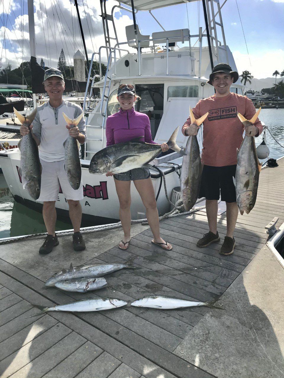 Joshua and family caught some nice fish on a half day! The bite started off slow, but then we found the sweet spot and started hooking up one after the other! They caught 3 1/2 Uku (gray snapper), 1 Ulua (giant trevelly), 2 Kahala (amberjack), and 2 Kamanu (rainbow runner).