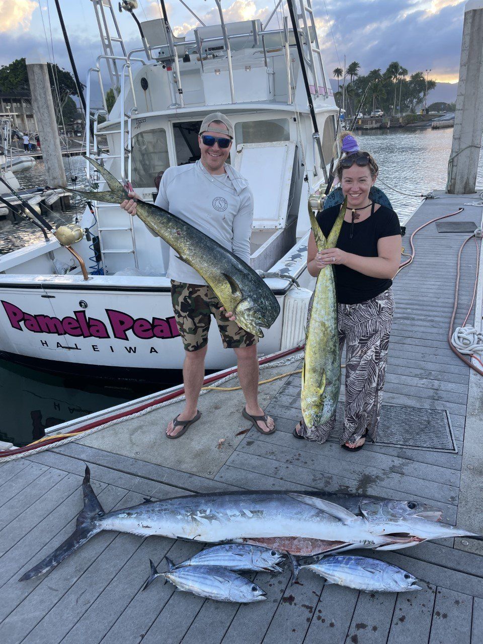 Ian and his wife got some nice fish! They caught this big striped marlin, some aku, and some good sized Mahimahi